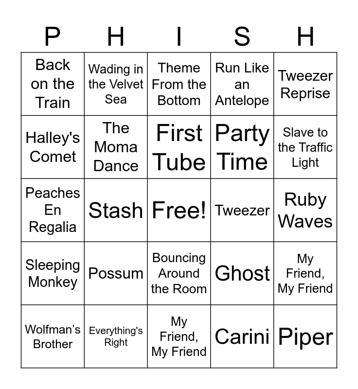 This bingo card has a free space and 29 words: Wolfman’s Brother, Free, Stash, Poor Heart, Back on the Train, Theme From the Bottom, The Moma Dance, Possum, Tweezer, Everything's Right, Ruby Waves, Piper, My Friend, My Friend, Carini, Slave to the Traffic Light, First Tube, Bouncing Around the Room, Sleeping Monkey, Tweezer Reprise, Peaches En Regalia, Ghost, Piper, Party Time, Halley's Comet, Run Like an Antelope, Wading in the Velvet Sea, My Friend, My Friend, First Tube and Blaze On.