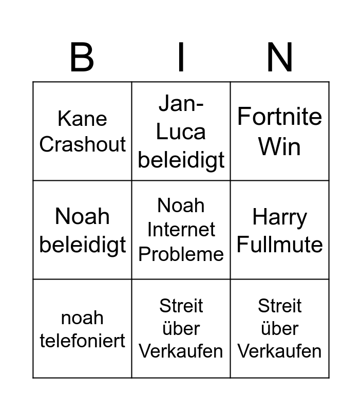 This bingo card has a free space and 9 words: noah telefoniert, Fortnite Win, Jan-Luca beleidigt, Noah beleidigt, Kane Crashout, Harry Fullmute, Streit über Verkaufen, N Bombe 0/3 and Streit über Verkaufen.