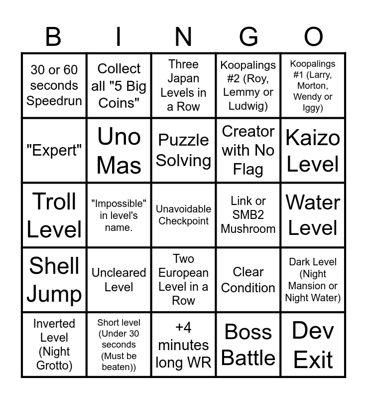 This bingo card has a free space and 24 words: Uncleared Level, Short level (Under 30 seconds (Must be beaten)), Puzzle Solving, Inverted Level (Night Grotto), Koopalings #1 (Larry, Morton, Wendy or Iggy), 30 or 60 seconds Speedrun, "Expert", Collect all "5 Big Coins", Link or SMB2 Mushroom, Two European Level in a Row, Creator with No Flag, Troll Level, Clear Condition, Dark Level (Night Mansion or Night Water), Uno Mas, Boss Battle, Water Level, Three Japan Levels in a Row, Kaizo Level, "Impossible" in level's name., Dev Exit, Shell Jump, Koopalings #2 (Roy, Lemmy or Ludwig) and +4 minutes long WR.