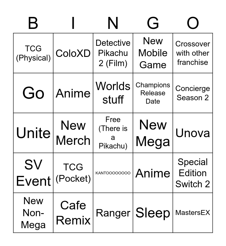 This bingo card has a free space and 24 words: TCG (Pocket), Cafe Remix, Worlds stuff, New Non-Mega, Crossover with other franchise, TCG (Physical), Go, ColoXD, New Mega, KANTOOOOOOOO, Champions Release Date, Unite, Anime, Special Edition Switch 2, Anime, Sleep, Unova, Detective Pikachu 2 (Film), Concierge Season 2, New Merch, MastersEX, SV Event, New Mobile Game and Ranger.