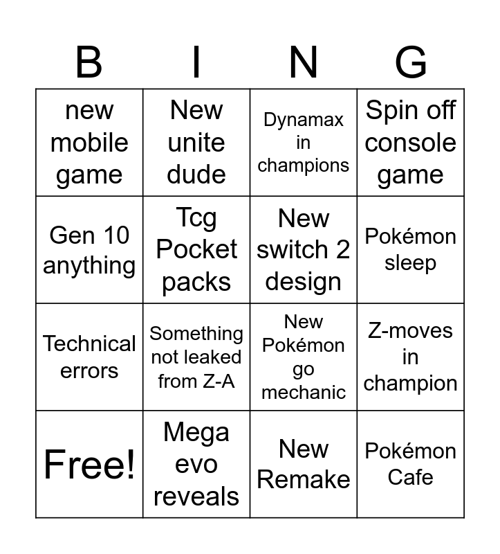 This bingo card has 16 words: Mega evo reveals, Z-moves in champion, Dynamax in champions, new mobile game, Technical errors, New unite dude, New Pokémon go mechanic, New Remake, Gen 10 anything, Tcg Pocket packs, Free!, Spin off console game, Something not leaked from Z-A, Pokémon sleep, New switch 2 design and Pokémon Cafe.