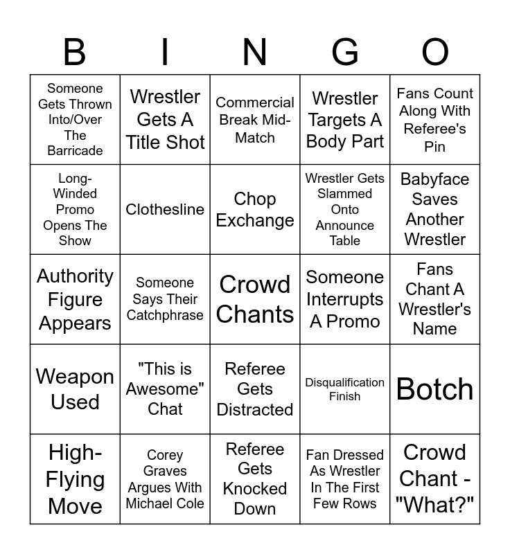 This bingo card has a free space and 24 words: "This is Awesome" Chat, Corey Graves Argues With Michael Cole, Chop Exchange, High-Flying Move, Fans Count Along With Referee's Pin, Someone Gets Thrown Into/Over The Barricade, Long-Winded Promo Opens The Show, Wrestler Gets A Title Shot, Someone Interrupts A Promo, Referee Gets Distracted, Wrestler Gets Slammed Onto Announce Table, Authority Figure Appears, Disqualification Finish, Botch, Clothesline, Fan Dressed As Wrestler In The First Few Rows, Fans Chant A Wrestler's Name, Commercial Break Mid-Match, Babyface Saves Another Wrestler, Someone Says Their Catchphrase, Crowd Chant - "What?", Weapon Used, Wrestler Targets A Body Part and Referee Gets Knocked Down.