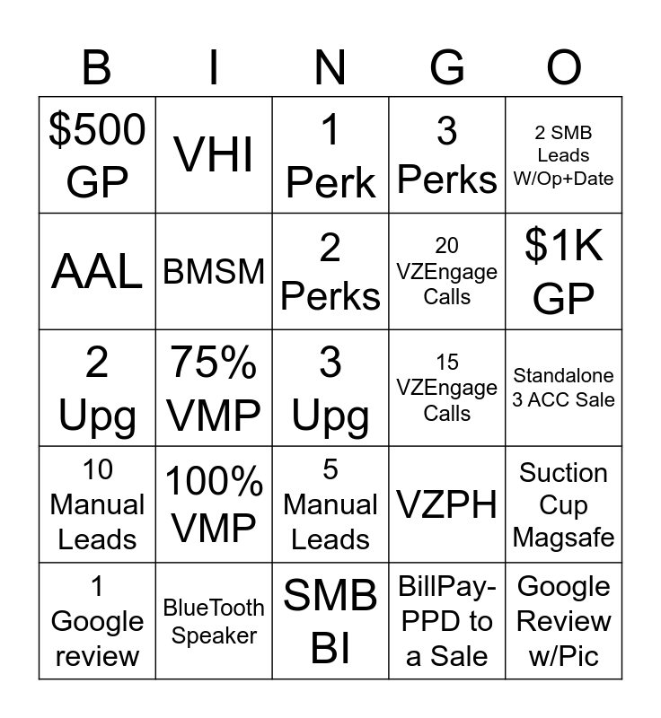 This bingo card has 25 words: 100% VMP, SMB BI, 2 Perks, 1 Google review, 2 SMB Leads W/Op+Date, $500 GP, AAL, VHI, 15 VZEngage Calls, 5 Manual Leads, 20 VZEngage Calls, 2 Upg, VZPH, Suction Cup Magsafe, BMSM, Google Review w/Pic, Standalone 3 ACC Sale, 1 Perk, $1K GP, 75% VMP, 3 Upg, BlueTooth Speaker, 10 Manual Leads, 3 Perks and BillPay-PPD to a Sale.