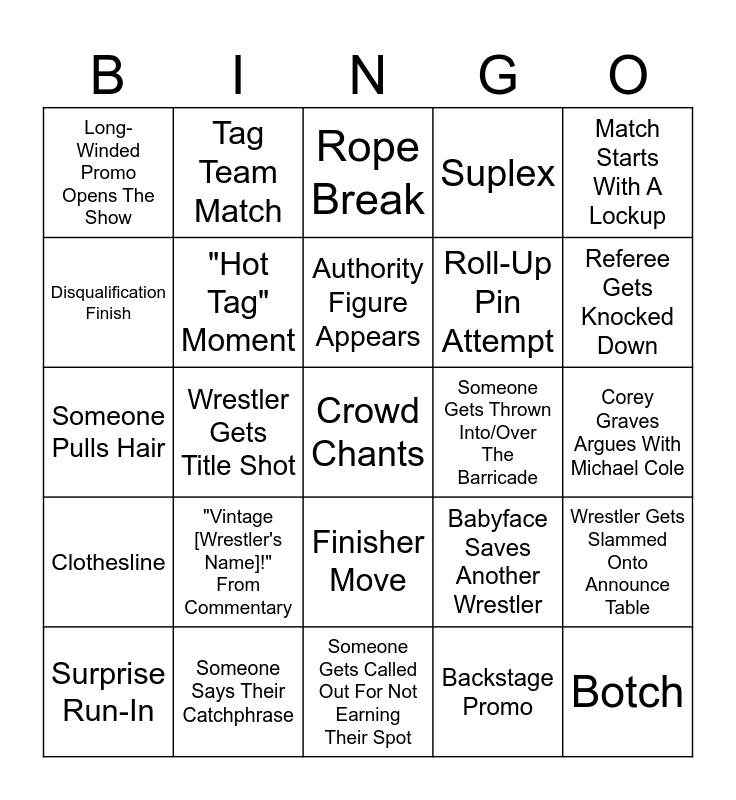 This bingo card has a free space and 24 words: "Vintage [Wrestler's Name]!" From Commentary, Someone Says Their Catchphrase, Authority Figure Appears, Surprise Run-In, Match Starts With A Lockup, Long-Winded Promo Opens The Show, Disqualification Finish, Tag Team Match, Someone Gets Thrown Into/Over The Barricade, Finisher Move, Roll-Up Pin Attempt, Someone Pulls Hair, Babyface Saves Another Wrestler, Wrestler Gets Slammed Onto Announce Table, "Hot Tag" Moment, Backstage Promo, Corey Graves Argues With Michael Cole, Rope Break, Referee Gets Knocked Down, Wrestler Gets Title Shot, Botch, Clothesline, Suplex and Someone Gets Called Out For Not Earning Their Spot.