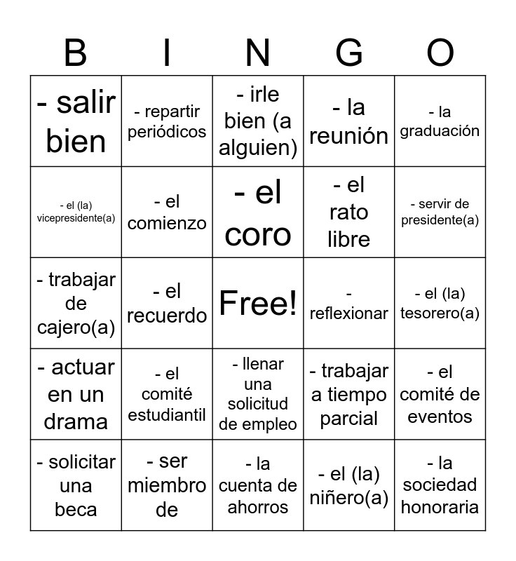 This bingo card has a free space and 38 words: - el anuario, - la ceremonia, - el código de vestimenta, - el comienzo, - el comité de eventos, - el comité estudiantil, - el coro, - el día feriado, - la graduación, - el rato libre, - el recuerdo, - la reunión, - la sociedad honoraria, - el (la) tesorero(a), - el (la) vicepresidente(a), - actuar en un drama, - graduarse, - irle bien (a alguien), - redactar, - reflexionar, - salir bien, - ser miembro de, - servir de presidente(a), - solicitar una beca, - tomar parte en, - la cuenta de ahorros, - cuidar niños, - el (la) diseñador(a) de páginas web, - el (la) empleado(a), - el empleo, - los impuestos, - llenar una solicitud de empleo, - el (la) niñero(a), - repartir periódicos, - el sueldo, - trabajar a tiempo parcial, - trabajar de cajero(a) and - trabajar de salvavidas.