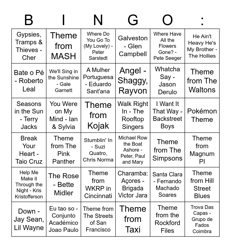 This bingo card has 62 words: Sukiyaki - A Taste of Honey, Michael Row the Boat Ashore - Peter, Paul and Mary, High Noon (Do Not Forsake Me) - Frankie Lane, Walk Right In - The Rooftop Singers, Help Me Make it Through the Night - Kris Kristofferson, You Don't Bring Me Flowers - Neil Diamon, Barbra Streisand, Bate o Pé - Roberto Leal, Verde Vinho - Paulo Alexandre, A Mulher Portuguesa - Eduardo Sant'ana, Mulher Gorda - Agrupamento Musical Diapasao, Galveston - Glen Campbell, Lovin' You - Minnie Riperton, He Ain't Heavy He's My Brother - The Hollies, The Rose - Bette Midler, Evergreen - Barbra Streisand, Gypsies, Tramps & Thieves - Cher, Seasons in the Sun - Terry Jacks, Where Have All the Flowers Gone? - Pete Seeger, Four Strong Winds - Ian & Sylvia, We'll Sing in the Sunshine - Gale Garnett, You Were on My Mind - Ian & Sylvia, Where Do You Go To (My Lovely) - Peter Sarstedt, Stumblin' In - Suzi Quatro, Chris Norma, Theme from Magnum PI, Theme from Hawaii 5-0, Theme from The Streets of San Francisco, Theme from Hill Street Blues, Theme from The Odd Couple, Theme from The Pink Panther, Theme from the Rockford Files, Theme from Quincy, Theme from Starsky and Hutch, Theme from Bonanza, Theme from Charlie's Angels, Theme from Kojak, Theme from MASH, Theme from St. Elsewhere, Theme from Taxi, Theme from The Waltons, Theme from WKRP in Cincinnati, Whatcha Say - Jason Derulo, Viva la Vida - Coldplay, I Want It That Way - Backstreet Boys, Everybody Get Up - Five, Angel - Shaggy, Rayvon, Break Your Heart - Taio Cruz, Down - Jay Sean, Lil Wayne, Radioactive - Imagine Dragons, Stay the Night - James Blunt, Spongebob Square Pants Theme Song, Pokémon Theme, Theme from The Simpsons, Capa Negra Rosa Negra - Fatum Grupo de Fados de Coimbra, Bairro Alto - Carlos Do Carmo, Vira de Coimbra: Douro Litoral - Brigada Victor Jara, Charamba: Açores - Brigada Victor Jara, Eu tao so - Conjunto Académico Joao Paulo, Trova Das Capas - Grupo de Fados Coimbra, Balada do Outono - José Afonso, Fado do Alentejo - Antonio Menano, Santa Clara - Fernando Machado Soares and Balada da Despedida - Joao Farinha, Ruze.