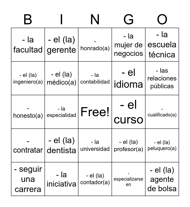 This bingo card has a free space and 49 words: - el (la) abogado(a), - el (la) agente de bolsa, - el (la) arquitecto(a), - el (la) contador(a), - el (la) dentista, - el (la) enfermero(a), - el (la) gerente, - el hombre de negocios, - el (la) ingeniero(a), - el (la) juez(a), - el (la) médico(a), - la mujer de negocios, - el (la) peluquero(a), - el (la) profesor(a), - el (la) traductor(a), - la administración de empresas, - la contabilidad, - el curso, - el derecho, - la escuela técnica, - la especialidad, - especializarse en, - la facultad, - el idioma, - la ingeniería, - las relaciones públicas, - seguir una carrera, - el título, - la universidad, - contratar, - el (la) dueño(a), - la empresa, - establecer, - la estrategia, - la iniciativa, - el plan financiero, - animado(a), - apasionado(a), - cualificado(a), - destacado(a), - educado(a), - eficiente, - fiable, - flexible, - honesto(a), - honrado(a), - motivado(a), - puntual and - versátil.