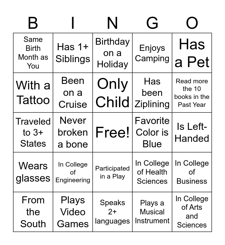 This bingo card has a free space and 24 words: In College of Engineering, Plays Video Games, Only Child, From the South, Has a Pet, Same Birth Month as You, With a Tattoo, Has 1+ Siblings, Favorite Color is Blue, Participated in a Play, Has been Ziplining, Traveled to 3+ States, In College of Health Sciences, In College of Business, Been on a Cruise, Plays a Musical Instrument, Is Left-Handed, Birthday on a Holiday, Read more the 10 books in the Past Year, Never broken a bone, In College of Arts and Sciences, Wears glasses, Enjoys Camping and Speaks 2+ languages.