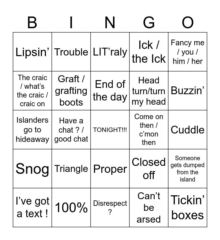 This bingo card has a free space and 35 words: Bombshell, Bird, Mad / it’s mad / movin mad, Graft / grafting boots, Proper, Ick / the Ick, The craic / what’s the craic / craic on, ‘Innit, End of the day, Islanders goes to terrace, Islanders go to hideaway, Fancy me / you / him / her, Banter, It is what it is, Lipsin’, Come on then / c’mon then, Can’t be arsed, Have a chat ? / good chat, Snog, Tickin’ boxes, Closed off, I’ve got a text !, Someone gets dumped from the island, 100%, LIT’raly, Buzzin’, Have a type / what’s your type?, Muggin’ / muggy / am I a mug?, Head turn/turn my head, Cuddle, Where’s your head at?, Disrespect ?, Triangle, Trouble and No good (that).