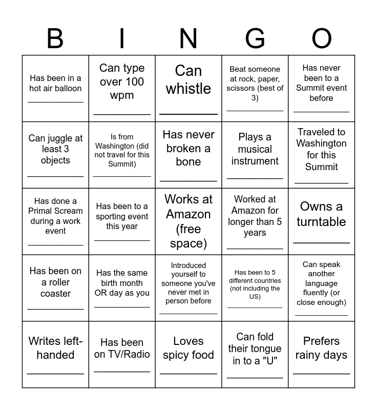 This bingo card has a free space and 24 words: Has the same birth month OR day as you ____________, Has been on TV/Radio __________, Has never broken a bone _________, Writes left-handed _________, Has never been to a Summit event before ____________, Has been in a hot air balloon ____________, Can juggle at least 3 objects ___________, Can type over 100 wpm _________, Worked at Amazon for longer than 5 years ___________, Introduced yourself to someone you've never met in person before ______________, Plays a musical instrument __________, Has done a Primal Scream during a work event ____________, Has been to 5 different countries (not including the US) _______________, Can speak another language fluently (or close enough) ____________, Is from Washington (did not travel for this Summit) ______________, Can fold their tongue in to a "U" __________, Owns a turntable ________, Can whistle _______, Traveled to Washington for this Summit __________, Has been to a sporting event this year ____________, Prefers rainy days _________, Has been on a roller coaster ___________, Beat someone at rock, paper, scissors (best of 3) _____________ and Loves spicy food _________.