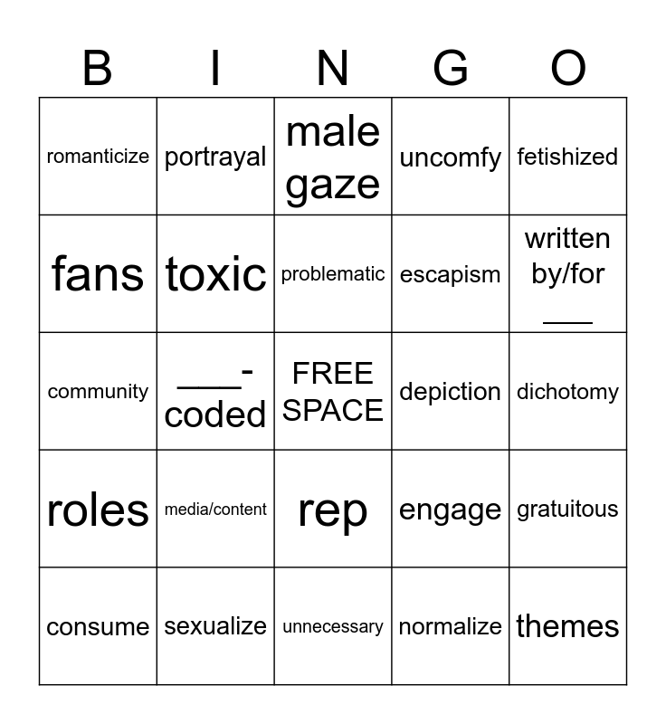 This bingo card has a free space and 24 words: media/content, sexualize, problematic, consume, fetishized, romanticize, fans, portrayal, depiction, rep, escapism, community, engage, gratuitous, toxic, normalize, dichotomy, male gaze, written by/for ___, ___-coded, themes, roles, uncomfy and unnecessary.