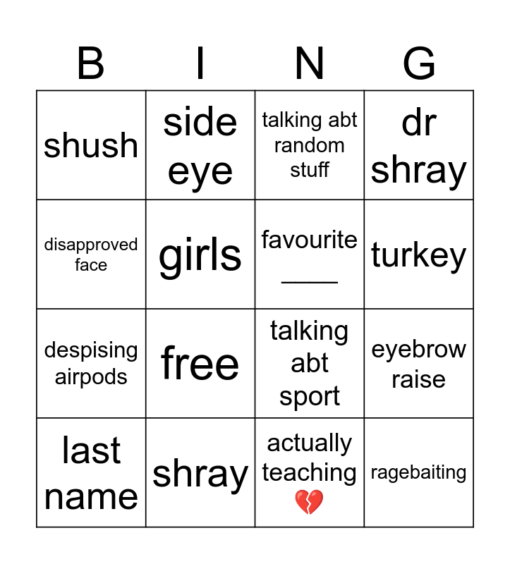 This bingo card has 19 words: talking abt sport, stop with the ____, talking abt random stuff, ragebaiting, eyebrow raise, disapproved face, actually teaching 💔, shush, side eye, despising airpods, free, girls, favourite ____, shray, last name, turkey, dr shray, turkey and last names.