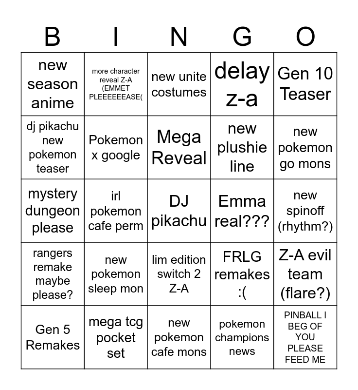 This bingo card has a free space and 24 words: new pokemon sleep mon, mega tcg pocket set, Mega Reveal, Gen 5 Remakes, Gen 10 Teaser, new season anime, dj pikachu new pokemon teaser, more character reveal Z-A (EMMET PLEEEEEEASE(, Emma real???, lim edition switch 2 Z-A, new plushie line, mystery dungeon please, FRLG remakes :(, Z-A evil team (flare?), Pokemon x google, pokemon champions news, new spinoff (rhythm?), new unite costumes, new pokemon go mons, irl pokemon cafe perm, PINBALL I BEG OF YOU PLEASE FEED ME, rangers remake maybe please?, delay z-a and new pokemon cafe mons.