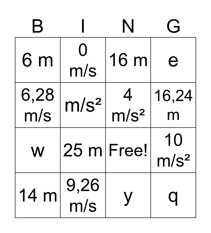 This bingo card has 22 words: 9,26 m/s, 50 metros, 0 m/s, 100 m, m/s², 4 m/s², 6 m, 16 m, Free!, q, w, e, r, t, y, u, 10 m/s², 14 m, 25 m, 6,28 m/s, 16,24 m and 3 m.