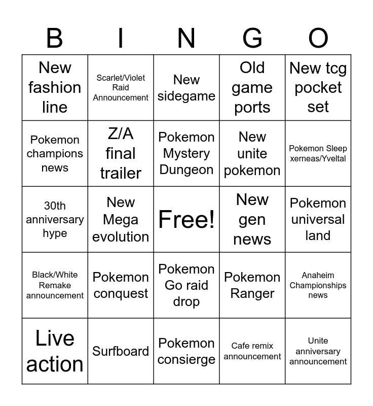 This bingo card has a free space and 24 words: Pokemon conquest, Surfboard, Pokemon Mystery Dungeon, Live action, New tcg pocket set, New fashion line, Pokemon champions news, Scarlet/Violet Raid Announcement, New gen news, Pokemon Go raid drop, New unite pokemon, 30th anniversary hype, Pokemon Ranger, Anaheim Championships news, Z/A final trailer, Cafe remix announcement, Pokemon universal land, New sidegame, Pokemon Sleep xerneas/Yveltal, New Mega evolution, Unite anniversary announcement, Black/White Remake announcement, Old game ports and Pokemon consierge.