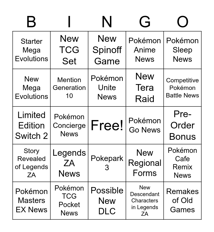 This bingo card has a free space and 24 words: Legends ZA News, Pokémon TCG Pocket News, Pokémon Unite News, Pokémon Masters EX News, Pokémon Sleep News, Starter Mega Evolutions, New Mega Evolutions, New TCG Set, Pokémon Go News, Pokepark 3, New Tera Raid, Limited Edition Switch 2, New Regional Forms, Pokémon Cafe Remix News, Mention Generation 10, New Descendant Characters in Legends ZA, Pre-Order Bonus, New Spinoff Game, Competitive Pokémon Battle News, Pokémon Concierge News, Remakes of Old Games, Story Revealed of Legends ZA, Pokémon Anime News and Possible New DLC.