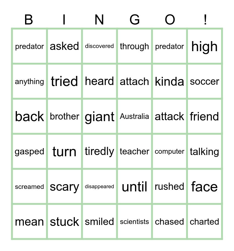 This bingo card has 1 images and 102 words: gigantic, furious, predator, loomed, reluctant, stealthily, fragile, triumph, suspicious, vanished, clutched, mysterious, cautiously, perilous, determined, charted, discovered, exhausted, answer, dream, loudly, morning, kingdom, started, attack, attach, through, threw, people, gasped, talking, questions, breakfast, mean, smiled, told, tired, tried, teacher, again, Australia, face, high, leaves, predator, fight, back, climb, screamed, table, scary, until, house, touch, orange, fire, baby, race, friend, giant, washing, messed, again, extremely, stuck, ground, asked, kinda, soccer, computer, capybara, mad, made, brother, very, handball, tiredly, biggest, spying, possum, mammal, anything, favourite, brother, recognised, disappeared, mainland, scientists, dash, tough, real, turn, chased, search, hear, heard, rushed, noise, found, habitat, turtle and frantic.