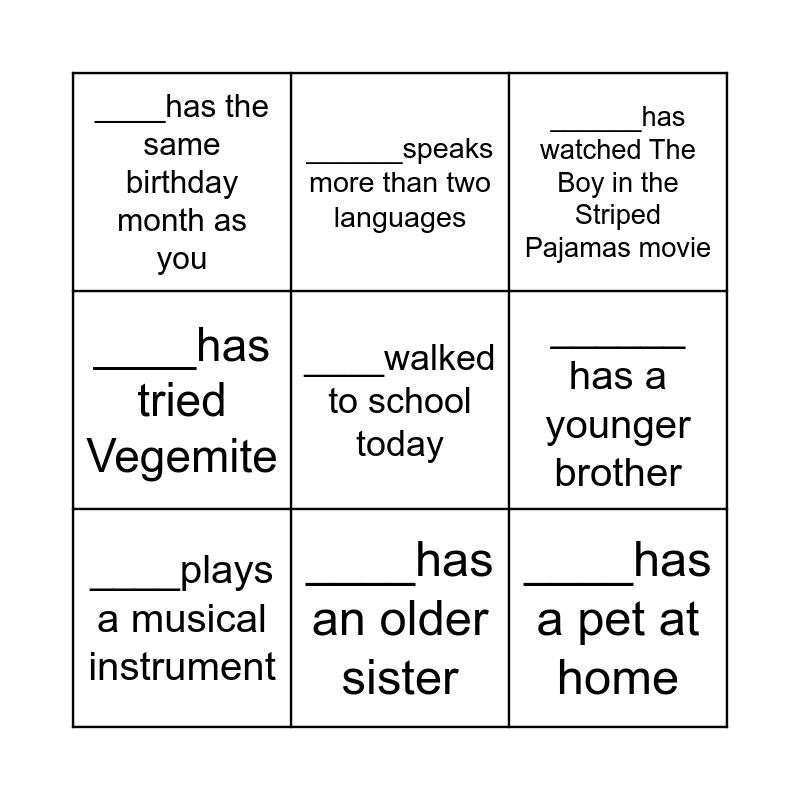 This bingo card has a free space and 8 words: ______ has a younger brother, ______has watched The Boy in the Striped Pajamas movie, ______speaks more than two languages, ____plays a musical instrument, ____has the same birthday month as you, ____has a pet at home, ____has tried Vegemite and ____has an older sister.