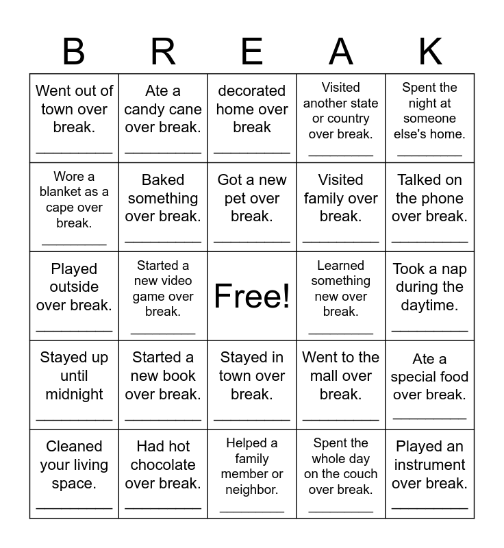 This bingo card has a free space and 24 words: Started a new book over break. _________, Had hot chocolate over break. _________, Got a new pet over break. _________, Cleaned your living space. _________, Spent the night at someone else's home. _________, Went out of town over break. _________, Wore a blanket as a cape over break. _________, Ate a candy cane over break. _________, Learned something new over break. _________, Stayed in town over break. _________, Visited family over break. _________, Played outside over break. _________, Went to the mall over break. _________, Ate a special food over break. _________, Baked something over break. _________, Spent the whole day on the couch over break. _________, Took a nap during the daytime. _________, decorated home over break _________, Talked on the phone over break. _________, Started a new video game over break. _________, Played an instrument over break. _________, Stayed up until midnight _________, Visited another state or country over break. _________ and Helped a family member or neighbor. _________.