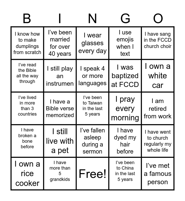 This bingo card has 25 words: I have broken a bone before, I have more than 5 grandkids, I’ve been to Taiwan in the last 5 years, I’ve been to China in the last 5 years, I have sang in the FCCD church choir, I know how to make dumplings from scratch, I’ve been married for over 40 years, I wear glasses every day, I pray every morning, I have went to church regularly my whole life, I’ve read the Bible all the way through, I still play an instrumen, Free!, I have dyed my hair before, I own a white car, I own a rice cooker, I have a Bible verse memorized, I speak 4 or more languages, I was baptized at FCCD, I am retired from work, I’ve lived in more than 3 countries, I still live with a pet, I’ve fallen asleep during a sermon, I use emojis when I text and I’ve met a famous person.