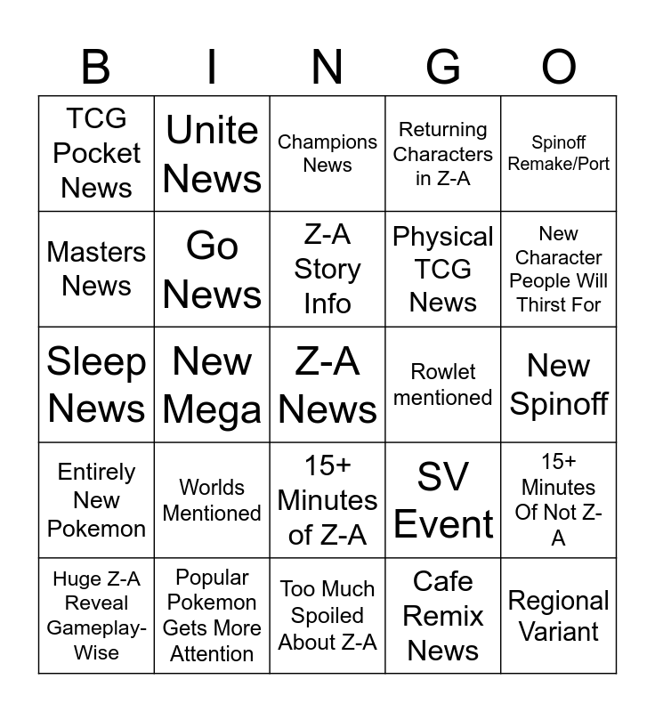 This bingo card has a free space and 24 words: Worlds Mentioned, Popular Pokemon Gets More Attention, Z-A Story Info, Huge Z-A Reveal Gameplay-Wise, Spinoff Remake/Port, TCG Pocket News, Masters News, Unite News, Rowlet mentioned, 15+ Minutes of Z-A, Physical TCG News, Sleep News, SV Event, 15+ Minutes Of Not Z-A, Go News, Cafe Remix News, New Spinoff, Champions News, New Character People Will Thirst For, New Mega, Regional Variant, Entirely New Pokemon, Returning Characters in Z-A and Too Much Spoiled About Z-A.