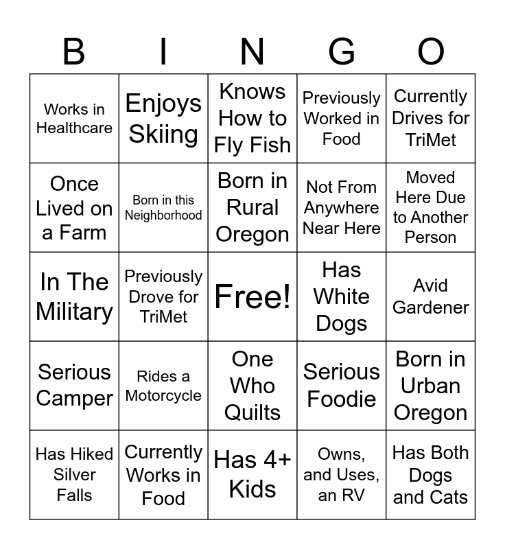 This bingo card has a free space and 24 words: Rides a Motorcycle, Currently Works in Food, Born in Rural Oregon, Has Hiked Silver Falls, Currently Drives for TriMet, Works in Healthcare, Once Lived on a Farm, Enjoys Skiing, Has White Dogs, One Who Quilts, Not From Anywhere Near Here, In The Military, Serious Foodie, Born in Urban Oregon, Born in this Neighborhood, Owns, and Uses, an RV, Avid Gardener, Knows How to Fly Fish, Moved Here Due to Another Person, Previously Drove for TriMet, Has Both Dogs and Cats, Serious Camper, Previously Worked in Food and Has 4+ Kids.