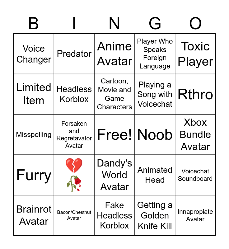 This bingo card has a free space and 36 words: "retroslop", Blue Hammer, Black Avatar, Headless Korblox, Animated Head, Furry, Cartoon, Movie and Game Characters, Femboy Avatar, Toxic Player, Exploiter, Forsaken and Regretavator Avatar, Player Who Speaks Foreign Language, OSC Avatar, Noob, Rthro, Voice Changer, Fake UGC Limited, 💔🥀, Innapropiate Avatar, Anime Avatar, Xbox Bundle Avatar, Voicechat Soundboard, Bacon/Chestnut Avatar, Brainrot Avatar, Fake Headless Korblox, Predator, Misspelling, Surviving with a Power-Up Machine, Playing a Song with Voicechat, Limited Item, Edgy Avatar, Scene/Emo Avatar, Getting a Golden Knife Kill, Dandy's World Avatar, Backstab and 360 Kill.