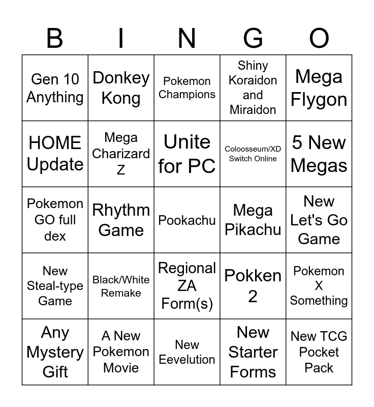 This bingo card has a free space and 24 words: Black/White Remake, A New Pokemon Movie, Unite for PC, Any Mystery Gift, Mega Flygon, Gen 10 Anything, HOME Update, Donkey Kong, Mega Pikachu, Regional ZA Form(s), Coloosseum/XD Switch Online, Pokemon GO full dex, Pokken 2, Pokemon X Something, Mega Charizard Z, New Starter Forms, New Let's Go Game, Pokemon Champions, 5 New Megas, Rhythm Game, New TCG Pocket Pack, New Steal-type Game, Shiny Koraidon and Miraidon and New Eevelution.