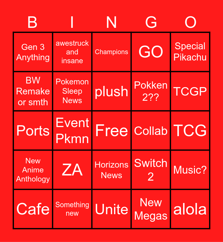 This bingo card has a free space and 24 words: ZA, Something new, plush, Cafe, Special Pikachu, Gen 3 Anything, BW Remake or smth, awestruck and insane, Collab, Horizons News, Pokken 2??, Ports, Switch 2, Music?, Pokemon Sleep News, New Megas, TCG, Champions, TCGP, Event Pkmn, alola, New Anime Anthology, GO and Unite.