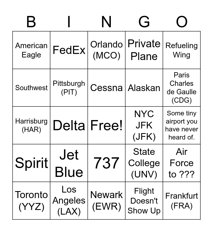 This bingo card has a free space and 67 words: Satellite, Space Junk, Diverted to PIT, Air Force to ???, Bi-plane, Going to the same airport it took off from, FedEx, UPS, Cessna, 747/A380, 737, 777, Some tiny airport you have never heard of., Refueling Wing, Helicopter, Southwest, Delta, American Eagle, United, Alaskan, Jet Blue, Spirit, Private Plane, Flight Doesn't Show Up, Dubai (DXB), Asia, Australia/New Zealand, Heathrow (LHR), Paris Charles de Gaulle (CDG), Dublin (DUB), Frankfurt (FRA), Ontario (ONT), Cleveland (CLE), Cincinnati (CVG), Columbus (CMH), Toronto (YYZ), Latrobe (LBE), State College (UNV), Harrisburg (HAR), Buffalo (BUF), Omaha (OMA), Pittsburgh (PIT), NYC JFK (JFK), O'Hare (ORD), Atlanta (ATL), Dallas Fort Worth (DFW), Denver (DEN), Los Angeles (LAX), Charlotte (CLT), Las Vegas (LAS), Orlando (MCO), Miami (MIA), Phoenix (PHX), Seattle (SEA), San Francisco (SFO), Newark (EWR), Houston (IAH), Boston (BOS), Minneapolis Saint Paul (MSP), NYC LaGuardia (LGA), Philadelphia (PHL), Baltimore (BWI), D.C. Dulles (IDA), D.C. Reagan (DCA), Tampa (TPA), Nashville (BNA) and Chicago Midway (MDW).