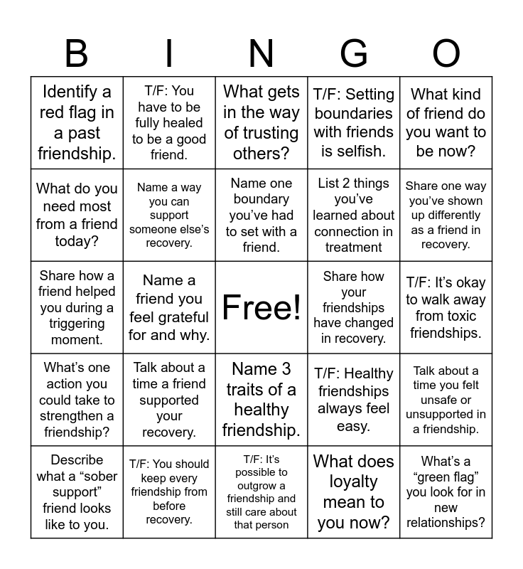 This bingo card has a free space and 24 words: Talk about a time a friend supported your recovery., T/F: You should keep every friendship from before recovery., Name one boundary you’ve had to set with a friend., Describe what a “sober support” friend looks like to you., What kind of friend do you want to be now?, Identify a red flag in a past friendship., What do you need most from a friend today?, T/F: You have to be fully healed to be a good friend., Share how your friendships have changed in recovery., Name 3 traits of a healthy friendship., List 2 things you’ve learned about connection in treatment, Share how a friend helped you during a triggering moment., T/F: Healthy friendships always feel easy., Talk about a time you felt unsafe or unsupported in a friendship., Name a way you can support someone else’s recovery., What does loyalty mean to you now?, T/F: It’s okay to walk away from toxic friendships., What gets in the way of trusting others?, Share one way you’ve shown up differently as a friend in recovery., Name a friend you feel grateful for and why., What’s a “green flag” you look for in new relationships?, What’s one action you could take to strengthen a friendship?, T/F: Setting boundaries with friends is selfish. and T/F: It’s possible to outgrow a friendship and still care about that person.