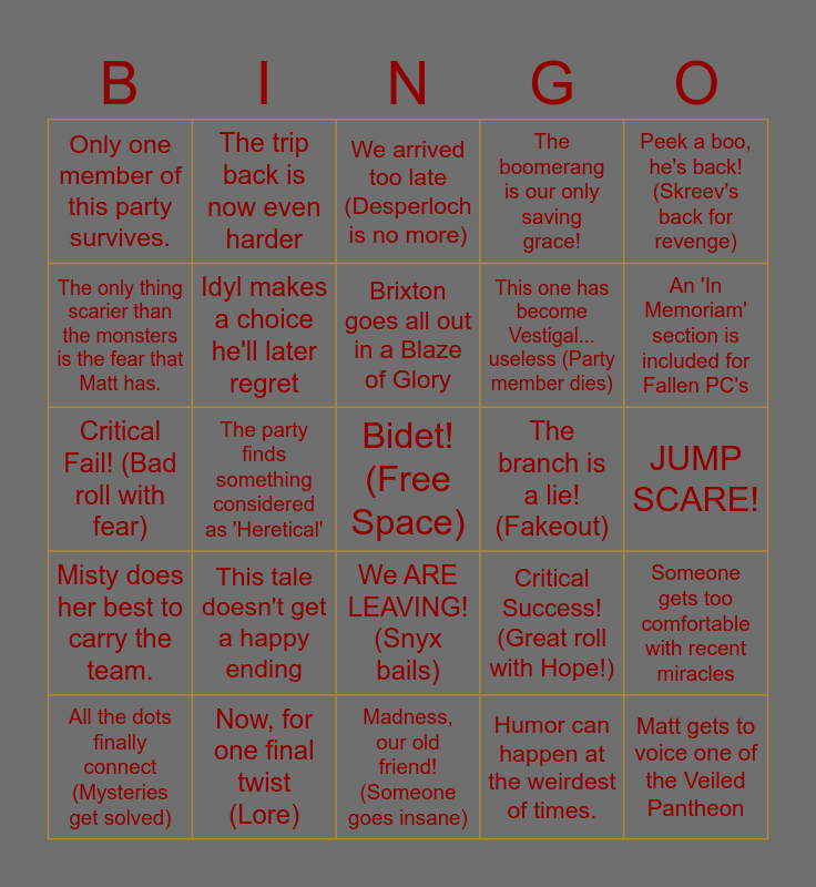 This bingo card has a free space and 24 words: This tale doesn't get a happy ending, Now, for one final twist (Lore), Brixton goes all out in a Blaze of Glory, All the dots finally connect (Mysteries get solved), Peek a boo, he's back! (Skreev's back for revenge), Only one member of this party survives., The only thing scarier than the monsters is the fear that Matt has., The trip back is now even harder, The branch is a lie! (Fakeout), We ARE LEAVING! (Snyx bails), This one has become Vestigal... useless (Party member dies), Critical Fail! (Bad roll with fear), Critical Success! (Great roll with Hope!), Someone gets too comfortable with recent miracles, Idyl makes a choice he'll later regret, Humor can happen at the weirdest of times., JUMP SCARE!, We arrived too late (Desperloch is no more), An 'In Memoriam' section is included for Fallen PC's, The party finds something considered as 'Heretical', Matt gets to voice one of the Veiled Pantheon, Misty does her best to carry the team., The boomerang is our only saving grace! and Madness, our old friend! (Someone goes insane).