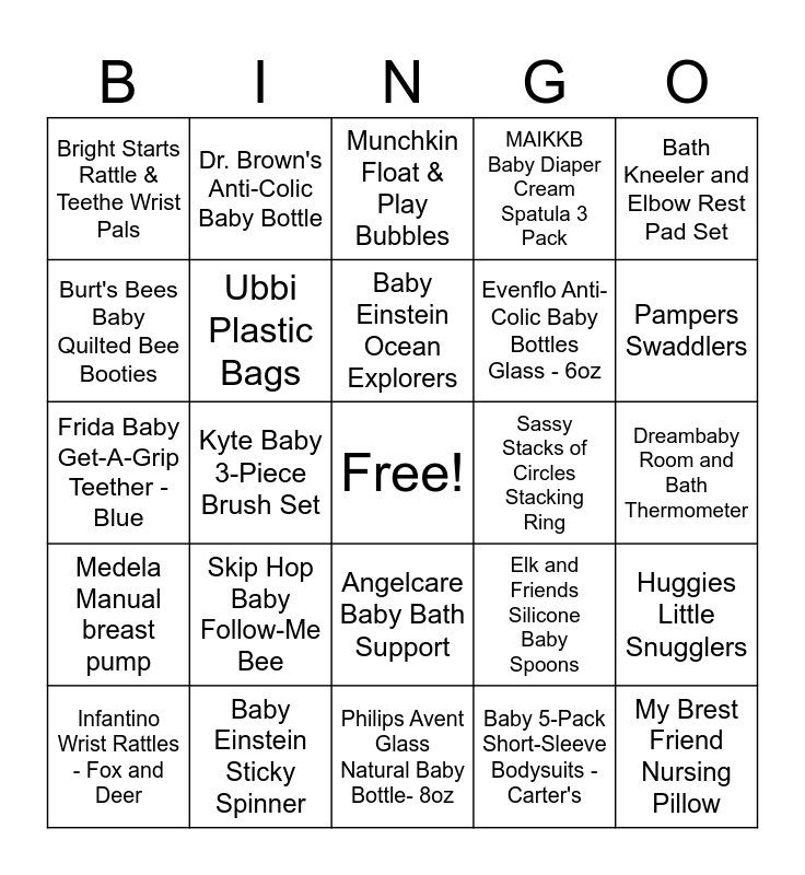 This bingo card has a free space and 26 words: Angelcare Baby Bath Support, Baby 5-Pack Short-Sleeve Bodysuits - Carter's, Baby Einstein Ocean Explorers, Baby Einstein Sticky Spinner, Bath Kneeler and Elbow Rest Pad Set, Bright Starts Rattle & Teethe Wrist Pals, Burt's Bees Baby Quilted Bee Booties, Dr. Brown's Anti-Colic Baby Bottle, Dreambaby Room and Bath Thermometer, Elk and Friends Silicone Baby Spoons, Evenflo Anti-Colic Baby Bottles Glass - 6oz, Frida Baby Get-A-Grip Teether - Blue, Huggies Little Snugglers, Infantino Wrist Rattles - Fox and Deer, Kyte Baby 3-Piece Brush Set, Lalo The Bib, MAIKKB Baby Diaper Cream Spatula 3 Pack, Medela Manual breast pump, Munchkin Float & Play Bubbles, My Brest Friend Nursing Pillow, Pampers Swaddlers, Philips Avent Glass Natural Baby Bottle- 8oz, Sassy Stacks of Circles Stacking Ring, Skip Hop Baby Follow-Me Bee, Ubbi Plastic Bags and Ultrasonic Cool Mist Humidifier & Soft Glow Night Light.