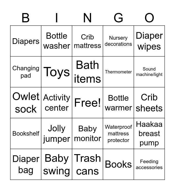 This bingo card has a free space and 24 words: Jolly jumper, Baby swing, Bath items, Diaper bag, Diaper wipes, Diapers, Changing pad, Bottle washer, Bottle warmer, Baby monitor, Thermometer, Owlet sock, Waterproof mattress protector, Haakaa breast pump, Toys, Books, Crib sheets, Crib mattress, Sound machine/light, Activity center, Feeding accessories, Bookshelf, Nursery decorations and Trash cans.