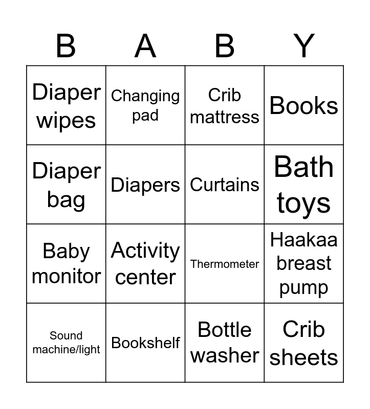 This bingo card has 26 words: Jolly jumper, Baby swing, Bath toys, Bath thermometer, Diaper bag, Diaper wipes, Diapers, Changing pad, Bottle washer, Bottle warmer, Baby monitor, Thermometer, Owlet sock, Waterproof mattress protector, Haakaa breast pump, Toys, Books, Crib sheets, Crib mattress, Sound machine/light, Activity center, Feeding accessories, Bookshelf, Nursery wall art, Curtains and Trash cans.