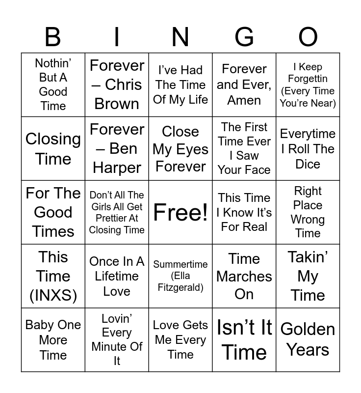 This bingo card has a free space and 74 words: (Every Time I Turn Around) Back In Love Again, (I Believe) Our Time Is Gonna Come, I’ve Had The Time Of My Life, 9 to 5, All Time Low, Always And Forever, Anytime, As Time Goes By, Baby One More Time, Back In Time, Big Time, Old Time Rock N’ Roll, Close My Eyes Forever, Closing Time, Does Anybody Really Know What Time It Is?, Don’t All The Girls All Get Prettier At Closing Time, Everyday Is A Winding Road, Everytime I Roll The Dice, Five Long Years, For The Good Times, Forever – Ben Harper, Forever – Chris Brown, Forever and Ever, Amen, Four Five Seconds, Golden Years, Good Times, Good Times Roll, Grandpa (Tell Me ‘Bout The Good Old Days), Hot Fun In The Summertime, I Don’t Wanna Live Forever, I Keep Forgettin (Every Time You’re Near), I Love You Always Forever, I Second That Emotion, I Won’t Need You Anymore, If I Could Turn Back Time, Isn’t It Time, It’s Time, Knock Three Times, Long Time, Long Time Coming, Love Gets Me Every Time, Lovin’ Every Minute Of It, Mr. Goodtime, New York Minute, Night Time Is The Right Time, Nothin’ But A Good Time, Nothing But Time, Once In A Lifetime Love, One Last Time, One Piece At A Time, Reeling In The Years, Remember The Time, Right Place Wrong Time, Rocket Man (I Think It’s Going To Be A Long Time), Sign O’ The Times (Prince), Sign Of The Times (Harry Styles), Summertime (Ella Fitzgerald), Summertime (DJ Jazzy Jeff), Take Your Time (Do It Right), Takin’ My Time, The First Time Ever I Saw Your Face, The Second Time Around, This Time (INXS), This Time (Waylon Jennings), This Time I Know It’s For Real, Three Times A Lady, Time After Time (Cyndi Lauper), Time After Time (Rod Stewart), Time Marches On, Time To Move On, Time Warp, Times Like These, Too Much Time On My Hands and Wasted Time.