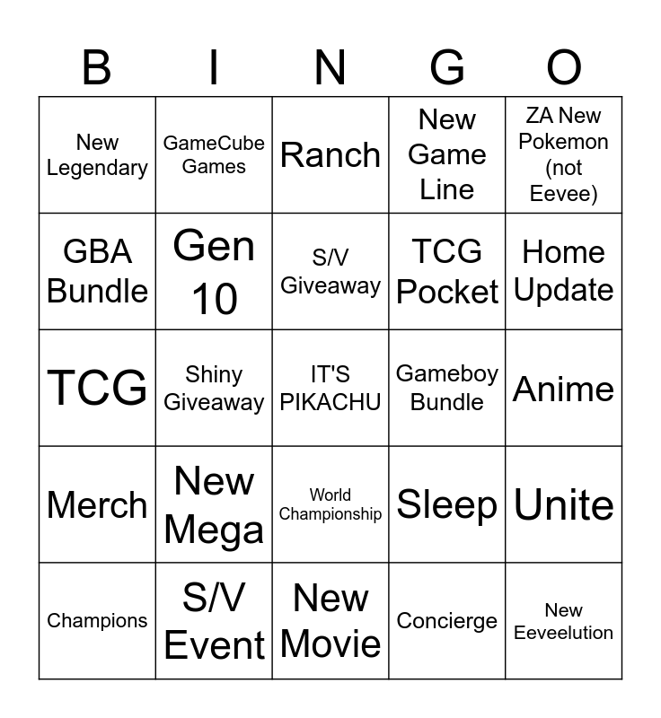This bingo card has a free space and 24 words: New Mega, S/V Event, S/V Giveaway, Champions, ZA New Pokemon (not Eevee), New Legendary, GBA Bundle, GameCube Games, Gameboy Bundle, World Championship, TCG Pocket, TCG, Sleep, Unite, Gen 10, Concierge, Anime, Ranch, Home Update, Shiny Giveaway, New Eeveelution, Merch, New Game Line and New Movie.