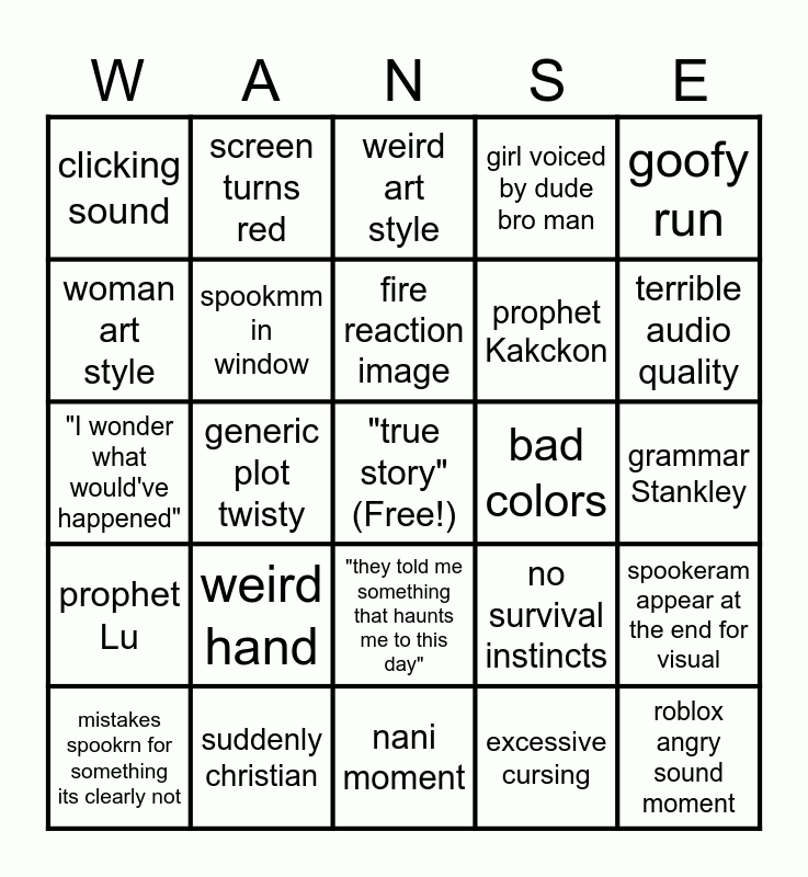 This bingo card has a free space and 41 words: same face syndrome, "I wonder what would've happened", red eyes, spookmm in window, suddenly christian, "they told me something that haunts me to this day", fire reaction image, goofy looking face, goofy run, prophet Lu, generic plot twisty, girl voiced by dude bro man, roblox angry sound moment, grammar Stankley, bad colors, weird hand, "creepy" in title, clicking sound, bloodshot eyes, weird art style, spookeram appear at the end for visual, scary smile, nani moment, prophet Kakckon, reusing sound, art styles don't match, excessive cursing, that one piano song, terrible audio quality, mc doesn't look their age, Wansee mentiomed, screen turns red, mistakes spookrn for something its clearly not, Lu hear me out moment, no survival instincts, woman art style, artist got lazzy, goofy scream, oddly realistic hand, goofy voice and animation doesnty match story.