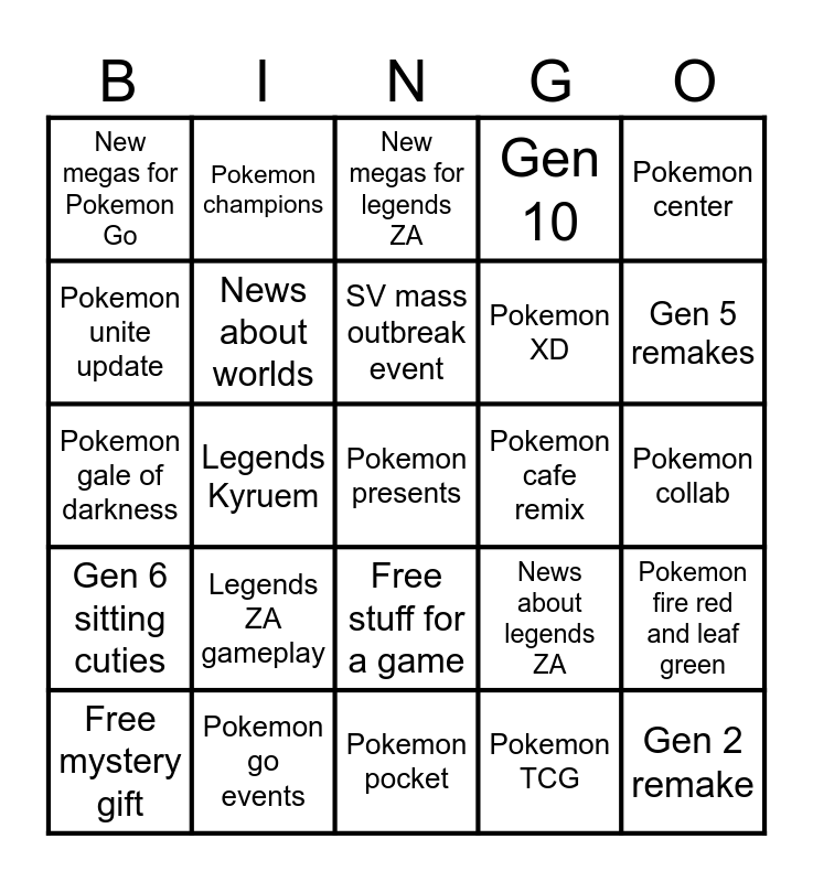 This bingo card has a free space and 24 words: Legends ZA gameplay, Pokemon go events, SV mass outbreak event, Free mystery gift, Pokemon center, New megas for Pokemon Go, Pokemon unite update, Pokemon champions, Pokemon cafe remix, Free stuff for a game, Pokemon XD, Pokemon gale of darkness, News about legends ZA, Pokemon fire red and leaf green, News about worlds, Pokemon TCG, Pokemon collab, New megas for legends ZA, Gen 5 remakes, Legends Kyruem, Gen 2 remake, Gen 6 sitting cuties, Gen 10 and Pokemon pocket.