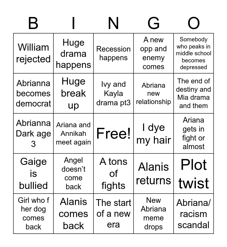 This bingo card has a free space and 24 words: Angel doesn’t come back, Alanis comes back, Ivy and Kayla drama pt3, Girl who f her dog comes back, Somebody who peaks in middle school becomes depressed, William rejected, Abrianna becomes democrat, Huge drama happens, I dye my hair, A tons of fights, Abriana new relationship, Abrianna Dark age 3, Alanis returns, Plot twist, Huge break up, New Abriana meme drops, Ariana gets in fight or almost, Recession happens, The end of destiny and Mia drama and them, Ariana and Annikah meet again, Abriana/ racism scandal, Gaige is bullied, A new opp and enemy comes and The start of a new era.
