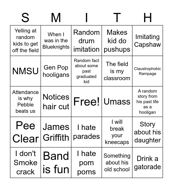 This bingo card has a free space and 24 words: James Griffith, Band is fun, Random fact about some past graduated kid, I don't Smoke crack, Imitating Capshaw, Yelling at random kids to get off the field, NMSU, When I was in the Blueknights, Umass, I hate parades, The field is my classroom, Attendance is why Pebble beats us, I will break your kneecaps, Story about his daughter, Gen Pop hooligans, Something about his old school, A random story from his past life as a hooligan, Random drum imitation, Claustrophobic Rampage, Notices hair cut, Drink a gatorade, Pee Clear, Makes kid do pushups and I hate pom poms.
