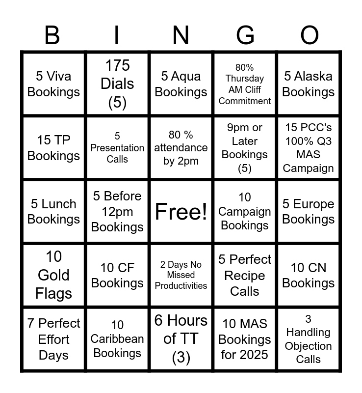 This bingo card has a free space and 24 words: 10 CF Bookings, 10 Caribbean Bookings, 80 % attendance by 2pm, 7 Perfect Effort Days, 5 Alaska Bookings, 5 Viva Bookings, 15 TP Bookings, 175 Dials (5), 10 Campaign Bookings, 2 Days No Missed Productivities, 9pm or Later Bookings (5), 5 Lunch Bookings, 5 Perfect Recipe Calls, 10 CN Bookings, 5 Presentation Calls, 10 MAS Bookings for 2025, 5 Europe Bookings, 5 Aqua Bookings, 15 PCC's 100% Q3 MAS Campaign, 5 Before 12pm Bookings, 3 Handling Objection Calls, 10 Gold Flags, 80% Thursday AM Cliff Commitment and 6 Hours of TT (3).