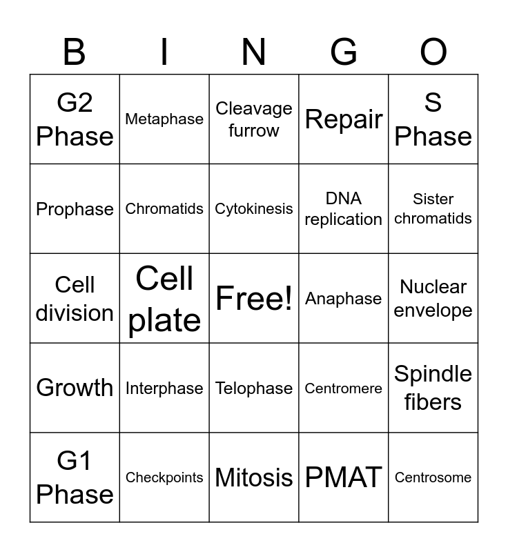 This bingo card has a free space and 25 words: Interphase, Mitosis, Cytokinesis, G1 Phase, S Phase, G2 Phase, Prophase, Metaphase, Anaphase, Telophase, DNA replication, Cell division, Centromere, Spindle fibers, Chromatids, Chromosomes, Nuclear envelope, Cleavage furrow, Sister chromatids, Cell plate, Centrosome, Checkpoints, Growth, Repair and PMAT.