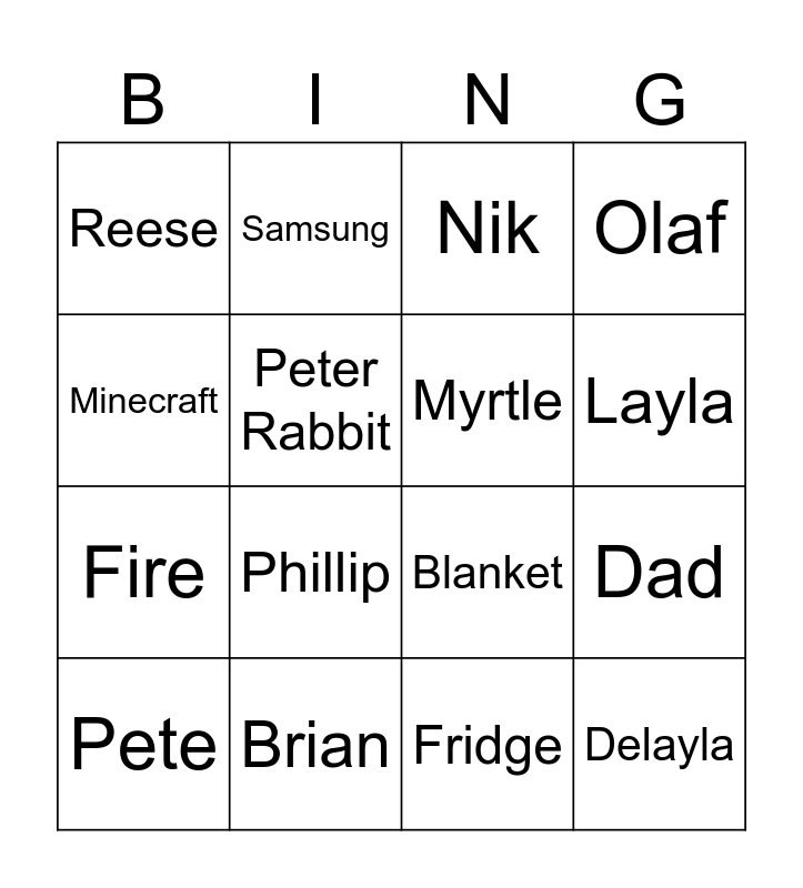 This bingo card has 16 words: Brian, Dad, Nik, Reese, Fire, Samsung, Blanket, Fridge, Minecraft, Peter Rabbit, Pete, Olaf, Phillip, Layla, Myrtle and Delayla.
