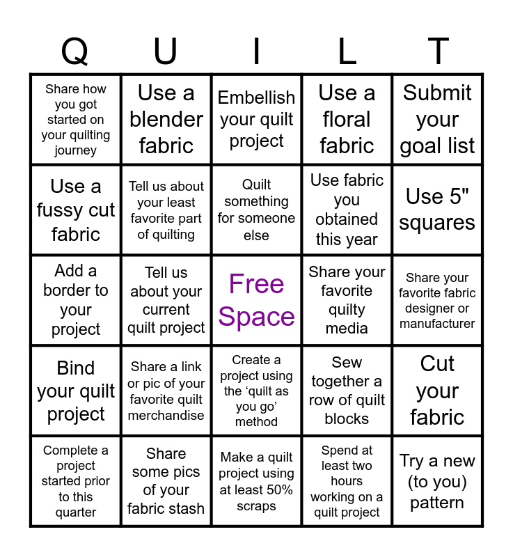 This bingo card has a free space and 28 words: Cut your fabric, Use a template (either to audition fabrics or for cutting fabric), Use fabric you obtained this year, Spend at least two hours working on a quilt project, Use a fussy cut fabric, Embellish your quilt project, Use a blender fabric, Bind your quilt project, Share your favorite quilty media, Complete a project started prior to this quarter, Add a border to your project, Use a floral fabric, Share some pics of your fabric stash, Make a quilt project using at least 50% scraps, Use 5" squares, Start a new project, Share a link or pic of your favorite quilt merchandise, Tell us about your least favorite part of quilting, Quilt something for someone else, Create a project using the ‘quilt as you go’ method, Share how you got started on your quilting journey, Share a helpful tip/trick, Try a new (to you) pattern, Tell us about your current quilt project, Share your favorite fabric designer or manufacturer, Sew together a row of quilt blocks, Submit your goal list and Complete a Quiltalong prompt/ challenge/ BOM.