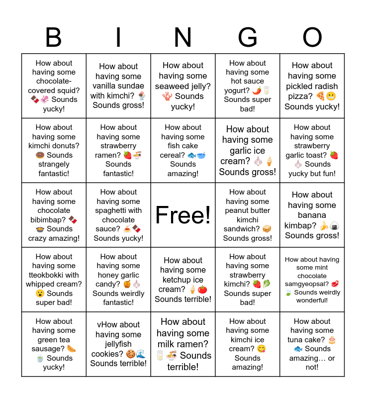 This bingo card has a free space and 32 words: How about having some kimchi ice cream? ๐ Sounds amazing!, How about having some wasabi cookies? ๐ช Sounds gross!, How about having some spaghetti with chocolate sauce? ๐๐ซ Sounds yucky!, How about having some cucumber cake? ๐๐ฅ Sounds terrible!, How about having some tteokbokki with whipped cream? ๐ฎ Sounds super bad!, How about having some strawberry ramen? ๐๐ Sounds fantastic!, How about having some pickled radish pizza? ๐๐ฌ Sounds yucky!, How about having some mint chocolate samgyeopsal? ๐ฅฉ๐ Sounds weirdly wonderful!, How about having some vanilla sundae with kimchi? ๐จ Sounds gross!, How about having some gochujang pancakes? ๐ฅ๐ฅ Sounds terrible!, How about having some fish cake cereal? ๐๐ฅฃ Sounds amazing!, How about having some seaweed jelly? ๐ชธ Sounds yucky!, How about having some corn dog with soy sauce? ๐ญ๐ถ Sounds fantastic!, How about having some yogurt rice? ๐๐ฅ Sounds super bad!, How about having some peanut butter kimchi sandwich? ๐ฅช Sounds gross!, How about having some ramen popsicle? ๐ก๐ Sounds silly but wonderful!, How about having some green tea sausage? ๐ญ๐ต Sounds yucky!, How about having some chocolate bibimbap? ๐ซ๐ฒ Sounds crazy amazing!, How about having some ketchup ice cream? ๐ฆ๐ Sounds terrible!, How about having some honey garlic candy? ๐ฏ๐ง Sounds weirdly fantastic!, How about having some strawberry kimchi? ๐๐ฅฌ Sounds super bad!, How about having some cheese tteok? ๐ง Sounds amazing!, How about having some banana kimbap? ๐๐ Sounds gross!, vHow about having some jellyfish cookies? ๐ช๐ Sounds terrible!, How about having some tuna cake? ๐๐ Sounds amazingโฆ or not!, How about having some hot sauce yogurt? ๐ถ๏ธ๐ฅ Sounds super bad!, How about having some garlic ice cream? ๐ง๐ฆ Sounds gross!, How about having some kimchi donuts? ๐ฉ Sounds strangely fantastic!, How about having some chocolate-covered squid? ๐ซ๐ฆ Sounds yucky!, How about having some milk ramen? ๐ฅ๐ Sounds terrible!, How about having some sausage milkshake? ๐ญ๐ฅค Sounds super bad! and How about having some strawberry garlic toast? ๐๐ง Sounds yucky but fun!.