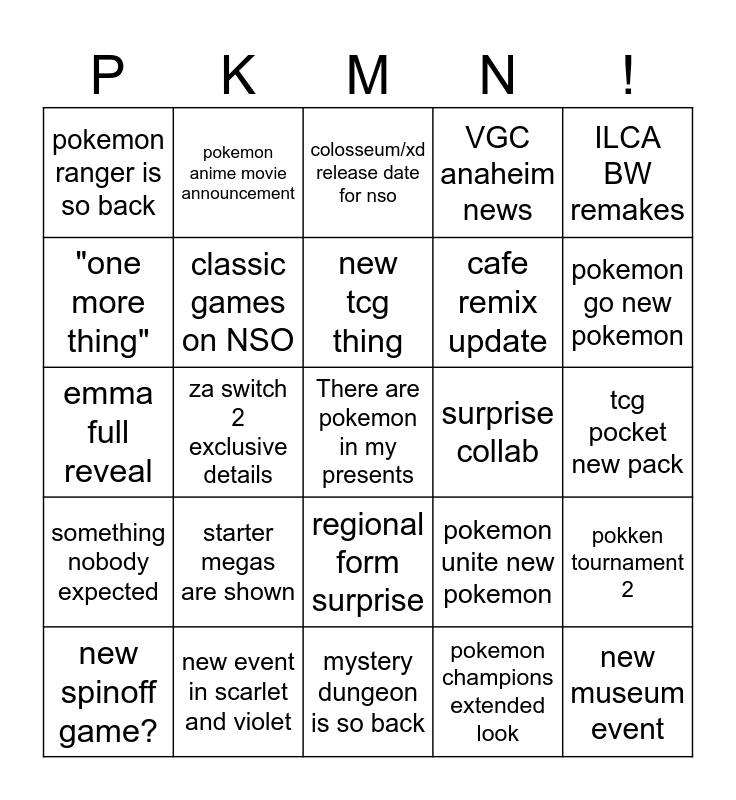 This bingo card has a free space and 24 words: starter megas are shown, new event in scarlet and violet, new tcg thing, new spinoff game?, ILCA BW remakes, pokemon ranger is so back, "one more thing", pokemon anime movie announcement, surprise collab, regional form surprise, cafe remix update, emma full reveal, pokemon unite new pokemon, pokken tournament 2, classic games on NSO, pokemon champions extended look, tcg pocket new pack, colosseum/xd release date for nso, pokemon go new pokemon, za switch 2 exclusive details, new museum event, something nobody expected, VGC anaheim news and mystery dungeon is so back.
