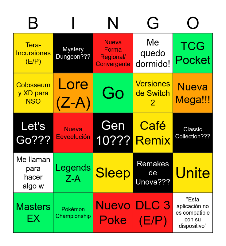 This bingo card has a free space and 24 words: Legends Z-A, Pokémon Championship, Go, Masters EX, TCG Pocket, Tera-Incursiones (E/P), Colosseum y XD para NSO, Mystery Dungeon???, Café Remix, Sleep, Versiones de Switch 2, Let's Go???, Remakes de Unova???, Unite, Lore (Z-A), DLC 3 (E/P), Classic Collection???, Nueva Forma Regional/ Convergente, Nueva Mega!!!, Nueva Eeveelución, "Esta aplicación no es compatible con su dispositivo", Me llaman para hacer algo w, Me quedo dormido! and Nuevo Poke.
