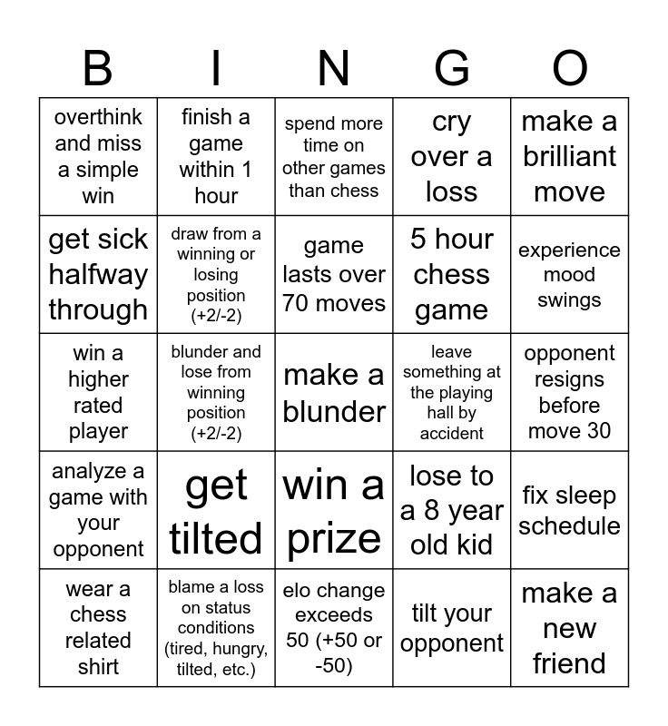 This bingo card has a free space and 24 words: get tilted, blame a loss on status conditions (tired, hungry, tilted, etc.), game lasts over 70 moves, wear a chess related shirt, make a brilliant move, overthink and miss a simple win, get sick halfway through, finish a game within 1 hour, leave something at the playing hall by accident, win a prize, 5 hour chess game, win a higher rated player, lose to a 8 year old kid, fix sleep schedule, draw from a winning or losing position (+2/-2), tilt your opponent, opponent resigns before move 30, spend more time on other games than chess, experience mood swings, blunder and lose from winning position (+2/-2), make a new friend, analyze a game with your opponent, cry over a loss and elo change exceeds 50 (+50 or -50).