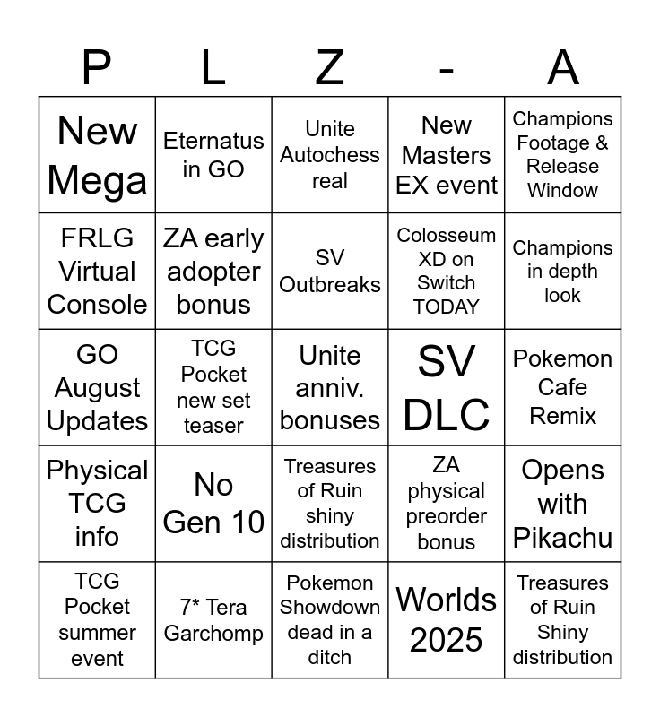 This bingo card has 26 words: Treasures of Ruin shiny distribution, Worlds 2025, SV Outbreaks, 7* Tera Garchomp, Champions Footage & Release Window, New Mega, FRLG Virtual Console, Eternatus in GO, Pokemon Cafe Remix, ZA physical preorder bonus, Colosseum XD on Switch TODAY, GO August Updates, Opens with Pikachu, TCG Pocket summer event, TCG Pocket new set teaser, New Sleep event, New Masters EX event, Physical TCG info, Unite Autochess real, Unite anniv. bonuses, Champions in depth look, Pokemon Showdown dead in a ditch, SV DLC, No Gen 10, ZA early adopter bonus and Treasures of Ruin Shiny distribution.